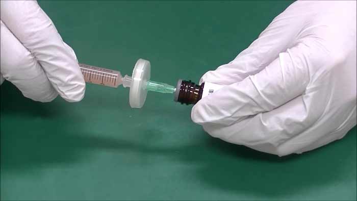 カプセル化試薬のキャップを開けて、アルコール綿でゴム栓の上を消毒し、破砕抗原液を注入します。